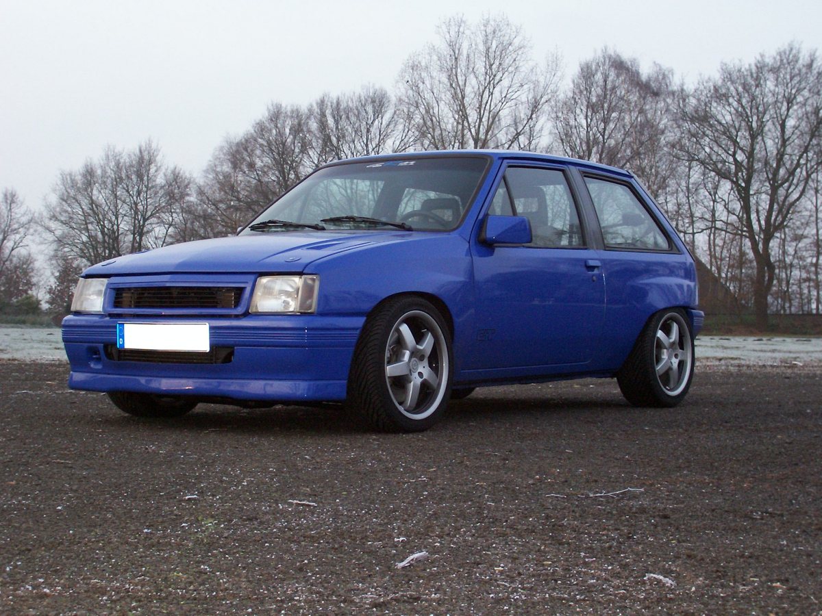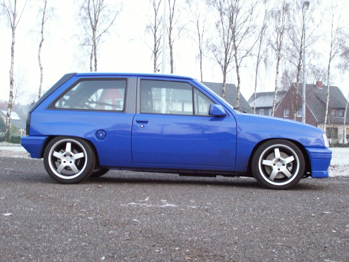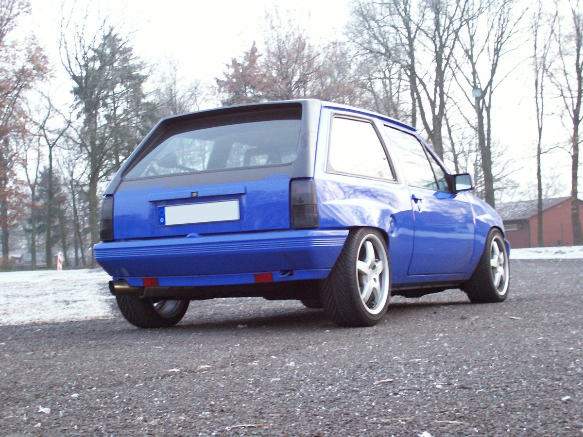 Bei mir hatte die Entscheidung, ein in der Höhe einstellbares Fahrwerk zu verbauen, einen ganz praktischen Hintergrund: Die Haltbarkeit meiner Antriebswellengelenke. Was bei einem schwächer motorisierten Corsa mit Smallblock-Motor noch nicht so gravierend auffällt, ist beim Turbo-Corsa nämlich schon eine ganz andere Sache. Durch extremes Tieferlegen verändert sich leider auch der Winkel der Antriebswellengelenke, wobei diese dann im Stand sehr schräg angewinkelt stehen. Diese Schrägstellung heisst dann allerdings leider auch, dass die gesamten Antriebskräfte nicht mehr rundum im Gelenk wirken, sondern eben in der eingewinkelten Stelle ziemlich punktuell. Und als Ergebnis erhält man dann laufend einen Ausfall der Antriebswellengelenke, welche nicht einmal mehr 10.000 km Laufleistung erreichen. Und wenn ein bereits beschädigtes Antriebswellengelenk dann auch mal heissläuft, dann kann es einem den Wagen bei z.B. längerer schneller Autobahnfahrt auch mal eben um ein/zwei Spuren verreissen, was natürlich lebensgefährlich ist! Deshalb habe ich mich auch entschlossen, auf die Optik nicht so viel Wert zu legen. Wichtiger ist mir, dass die Höhe möglichst gut darauf abgestimmt ist, um im Stand bei halbvoller Beladung möglichst waagerecht stehende Antriebswellen zu haben. Wegen dem tiefer bauenden Zweiliter-Motor sind extreme Tieferlegungen sowieso kaum mehr möglich, so dass ich das "so tief wie es geht" Thema eh schon abgehakt hatte. Ich finde aber, so schlecht steht "mein Kleiner" gar nicht da ;o)