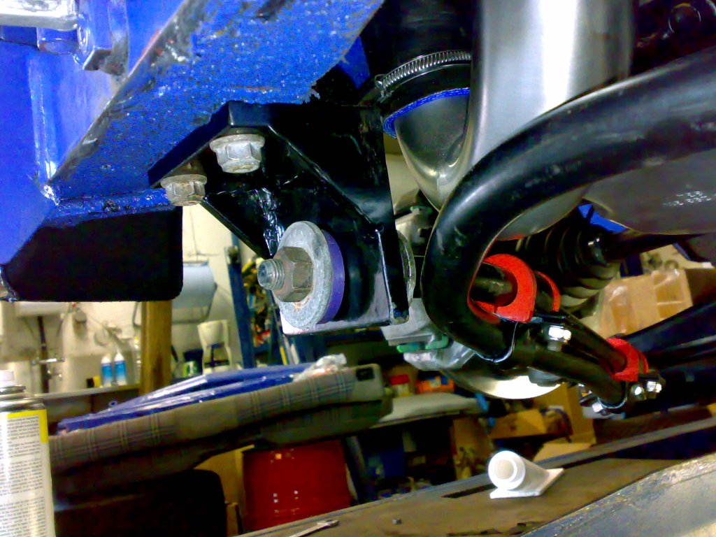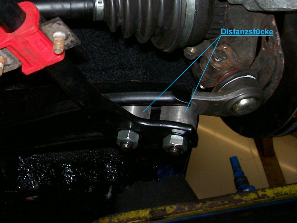Aber keine Panik, denn sooo gravierend ist der Umbau auch wieder nicht. In Serie wird der Stabilisator mit Befestigungsschellen unterhalb der Zugstreben verschraubt, die ihrerseits zwischen Querlenker und Frontträger befestigt sind. Und dieses gesamte "Gestell" muss aufgrund der raumgreifenden Bauweise des Getriebes um rund zwei Zentimeter abgesenkt werden, um unter das Getriebe zu passen. An den Querlenkern ist das auch überhaupt kein Problem. Hier reichen einfache Distanzstücke schon aus, um eine entsprechend tiefere Position zu erreichen.