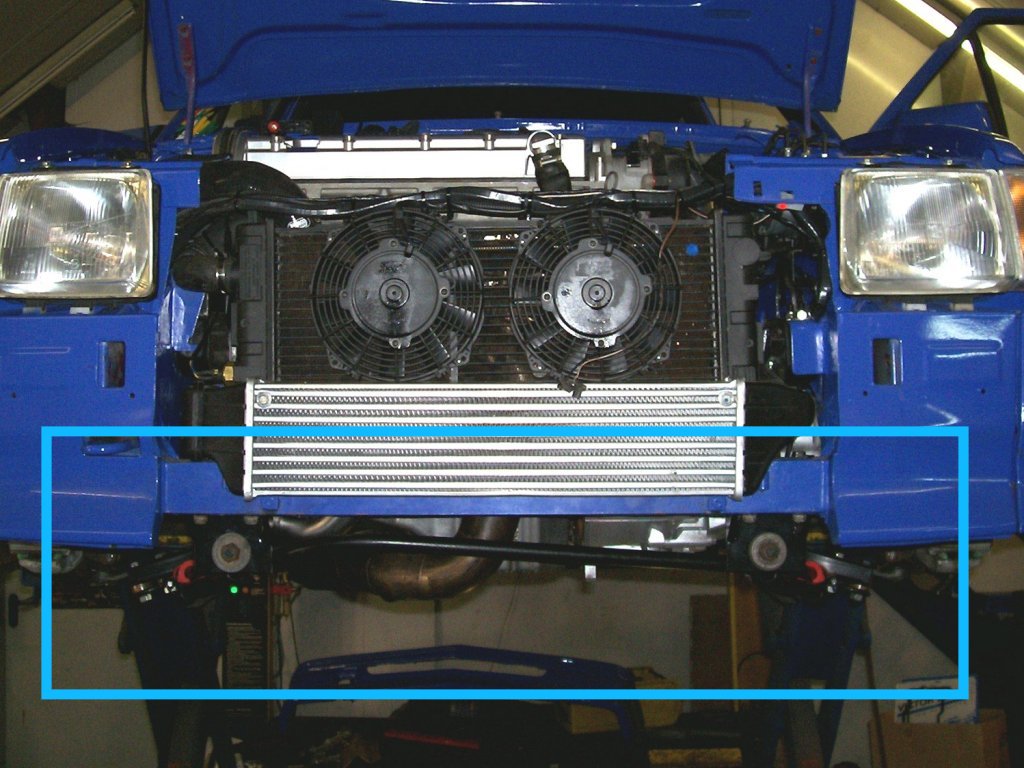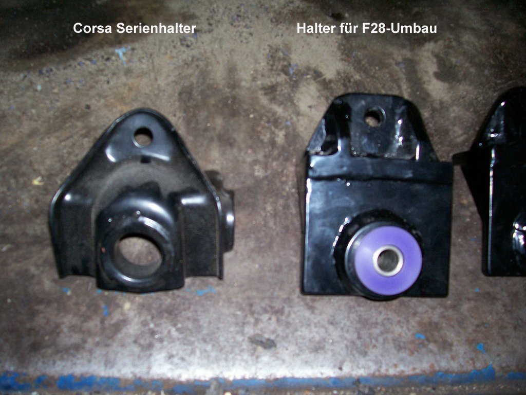 Bei den am Frontträger befestigten Zugstrebenhaltern hat sich die Distanzblock-Methode allerdings als potentielle Gefahr herausgestellt. Wegen dem grösseren Hebelarm, den die Zugstrebenhalter dann auf das untere Frontträgerblech ausüben, sind hier schon einige gerissene Frontträgerbleche bei umgebauten Corsa aufgetreten!