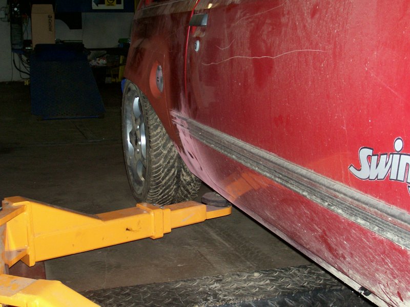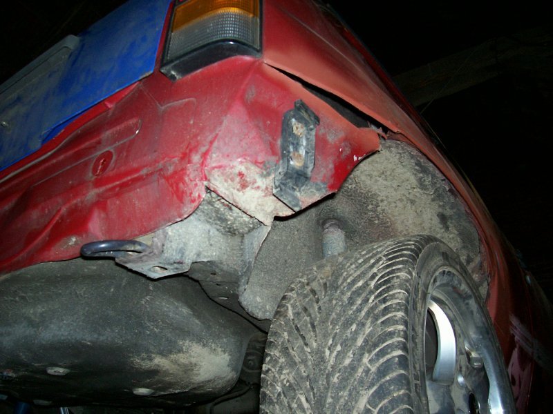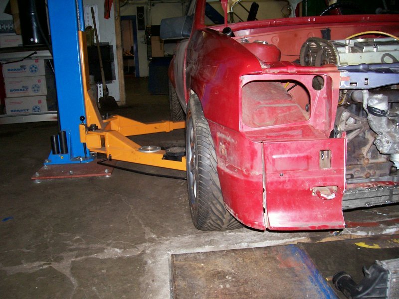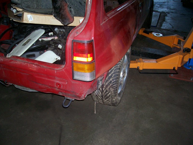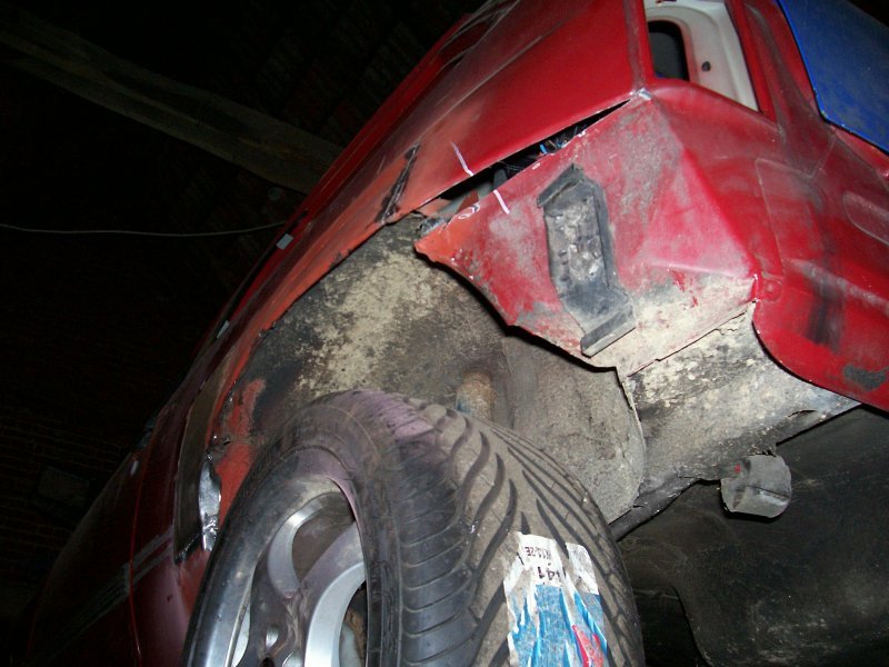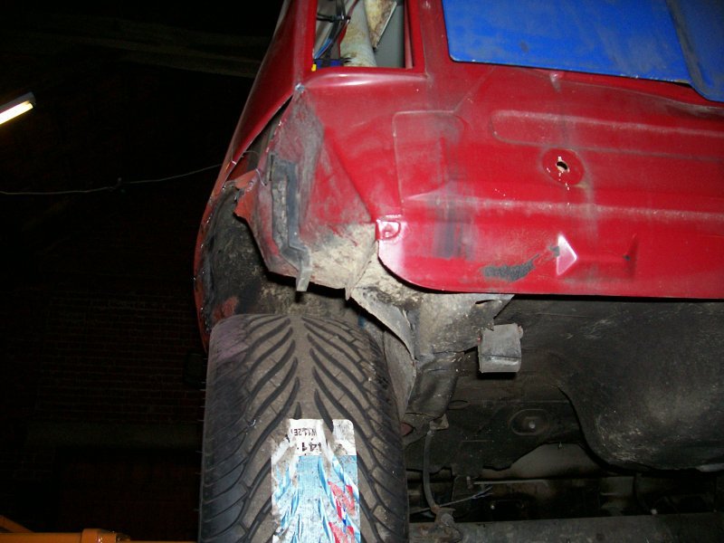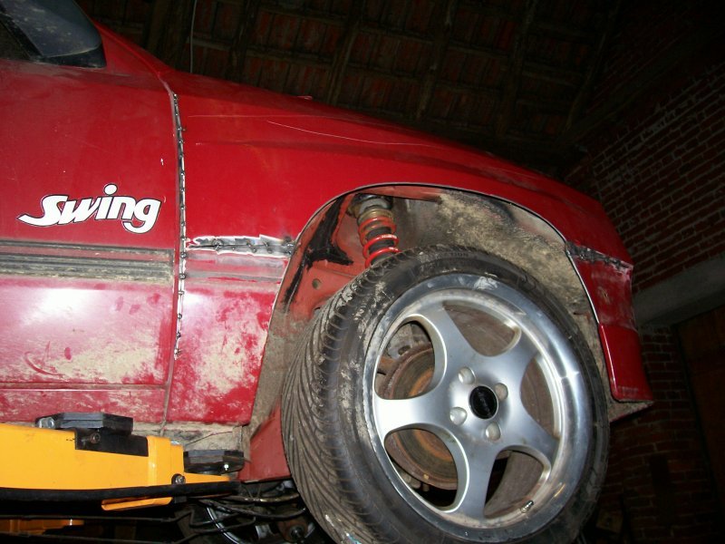 Auf den Bildern ist teils auch mit komplett heruntergedrehtem Gewindefahrwerk gearbeitet worden, um auf jeden Fall ein Aufsetzen des Vorderrades an irgendein Karosserieblech zu vermeiden. Und beim gesamtflächigen Ziehen des Kotflügels stellte sich dann auch schnell heraus, dass es nur mit Ziehen und eingeschweissten Ecken nicht getan ist. Auch das Spaltmass zwischen Tür und Kotflügel vergrösserte sich deutlich, so dass sogar am Kotflügelabschluss noch ein kleiner Blechstreifen zum Ausgleich des Spaltmasses eingeschweisst werden musste. An der Hinterachse ist für die Blecharbeiten mangels Gewindeverstellmöglichkeit dann gleich gar keine Feder eingebaut gewesen. Ich wollte nämlich auf jeden Fall verhindern, noch Federwegsbegrenzer verbauen zu müssen, auch wenn deshalb die Karosseriearbeiten etwas aufwendiger ausfallen. Allerdings wird mir dies im Fahrverhalten dann wieder zugute kommen, denn wer in einer welligen Kurve mal auf eben jenen Federwegsbegrenzer aufsetzt (oder herumhoppelt), der weiss was ich meine.