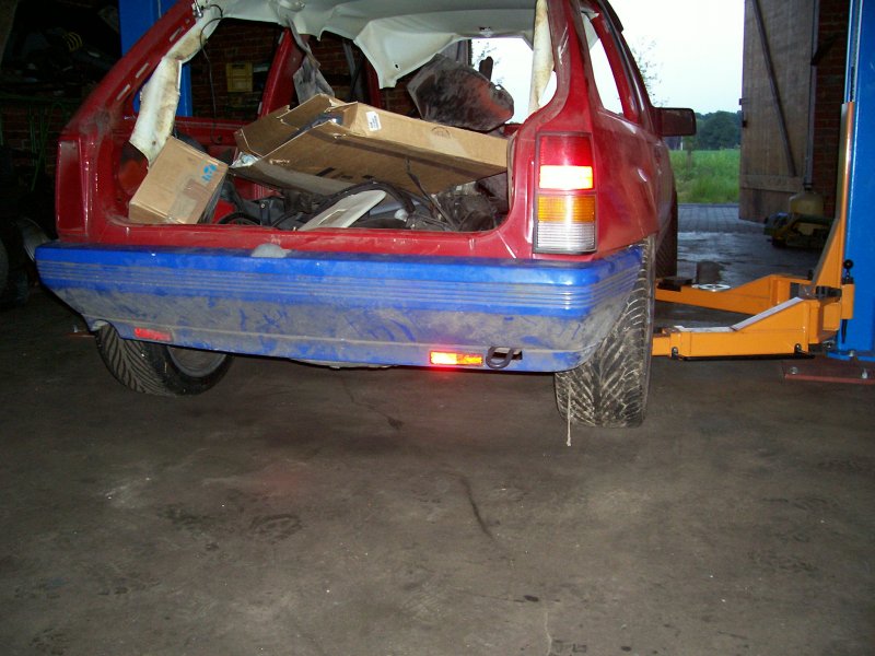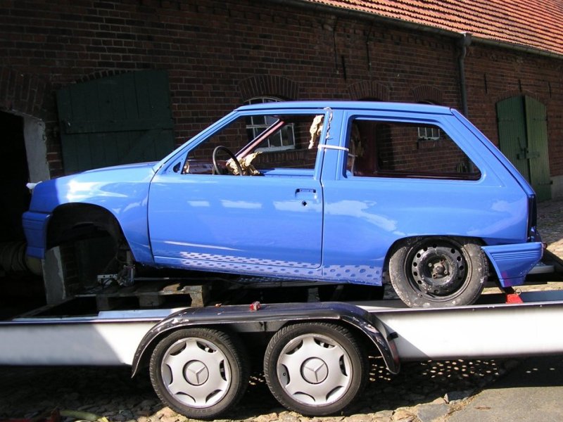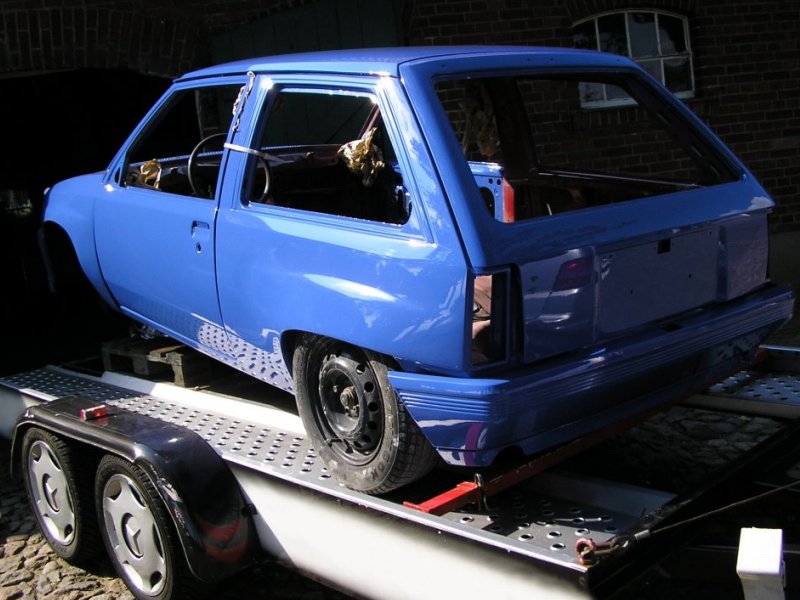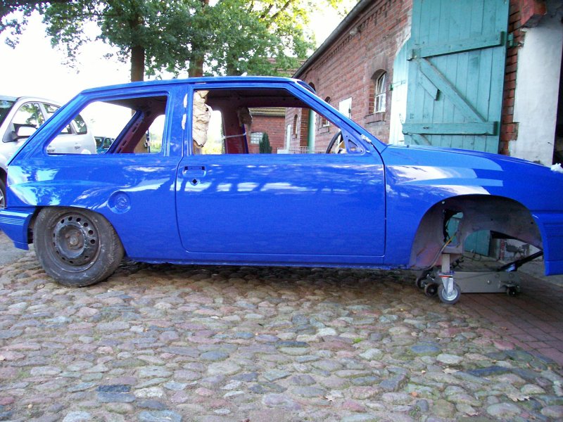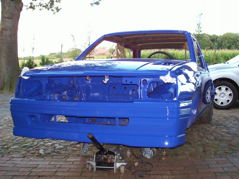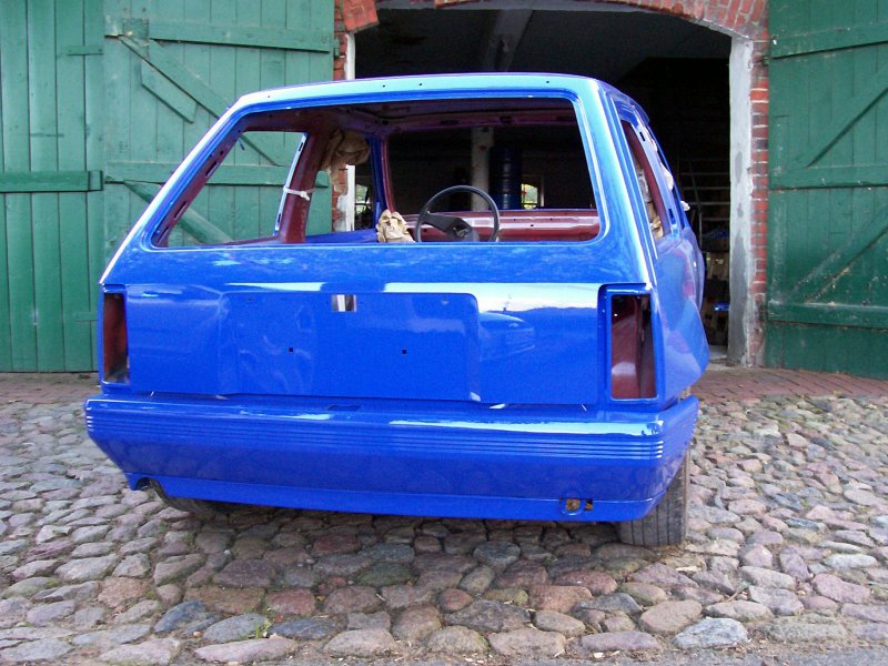 Es handelt sich übrigens auch "nur" um eine Aussenlackierung, da der Innenraum mit meiner alten GSi-Ausstattung versehen wird, welche die rotlackierten Restflächen komplett abdecken wird. Die reine Aussenlackierung war eine reine Kostenfrage, da mir auch momentan das Geld fehlt, um gleich in einem Rutsch ein "Show and Shine" Fahrzeug aufzubauen (was es eh nicht werden soll). Vorrang hat bei mir definitiv erst einmal die technisch saubere Basis. Für weitere Verbesserungen ist später ja immer noch Zeit, wenn wieder Geld vorhanden ist. Die Kotflügel vorne sind derzeit nur angesteckt und noch nicht angepasst, genauso wie die Heckklappe. Zudem fehlt ja auch noch jeglicher Kontrastpunkt zur gesamtblauen Karosserie, so dass die Farbe nun noch etwas stechender im Vordergrund steht, als es später bei montierten Leuchten, Nummernschildern, Rädern, Aufklebern und so weiter der Fall sein wird. Ausserdem wirkt die Farbe auch immer komplett anders, je nach Sonnenschein oder Blitzlicht, obwohl es KEIN Effektlack ist. Aber nun zu den Fotos: