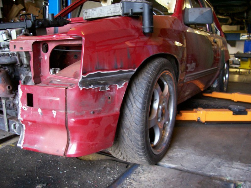 Mein Wunsch war also eher, dass man wohl auf dem zweiten Blick erkennen kann, dass die Karosserie nachgearbeitet worden ist. Allerdings soll der erste Eindruck eher vermitteln, dass diese Felgenbreite eigentlich auch so auf jeden Corsa draufpassen müsste. Das heisst dann also, dass der originale Radlauf in seiner generellen Bauform nicht entscheidend verändert werden darf: Hierfür wird im Grunde zuerst der Aussenradlauf vom Innenradlauf getrennt, sowie vorne und hinten eingeschnitten und dieser dann entsprechend grossflächig nach aussen gebogen. Der dann entstehende Spalt vorne und hinten der Auftrennung wird dann mit kleineren Zwischenblechen überbrückt und sämtliche offenen Stellen sowie der Innenradlauf wieder sauber verschweisst. Und bei den vorderen Kotflügeln reicht nur das Einschneiden, Aufweiten und wieder Verschweissen, da vorne der Innenradlauf mit zur Karosserie gehört und lediglich verlängert werden muss. ABER: Was sich hier alles so einfach liest, erforderte die erfahrene Hand eines Karosseriebauers, bei dem ich mich an dieser Stelle nochmal ganz herzlich für die hervorragende Umsetzung meiner Idee bedanken möchte: Besonders aufschlussreich sind die Bilder, bei denen von unten ins Radhaus geschaut wird. Anhand dieser Fotos erkennt man am Besten, wie weit das Radhaus nach aussen getrieben werden musste, um Freigang für die 215er Reifen auf einer 7,5Jx16-Felge zu bekommen. Laut TÜV-Vorgabe muss, wenn man frontal auf die Felge schaut und sich dabei eine Uhr mit Stundenzeiger vorstellt, von der 10:00 Uhr bis zur 14:00 Uhr-Stellung (siehe auch Foto 1) die Reifenlauffläche komplett abgedeckt sein - was mit den Umbaumassnahmen in Verbindung mit den originalen Schürzen auch gelang. Anbei ein paar Bilder vom Umbau der Radhäuser: